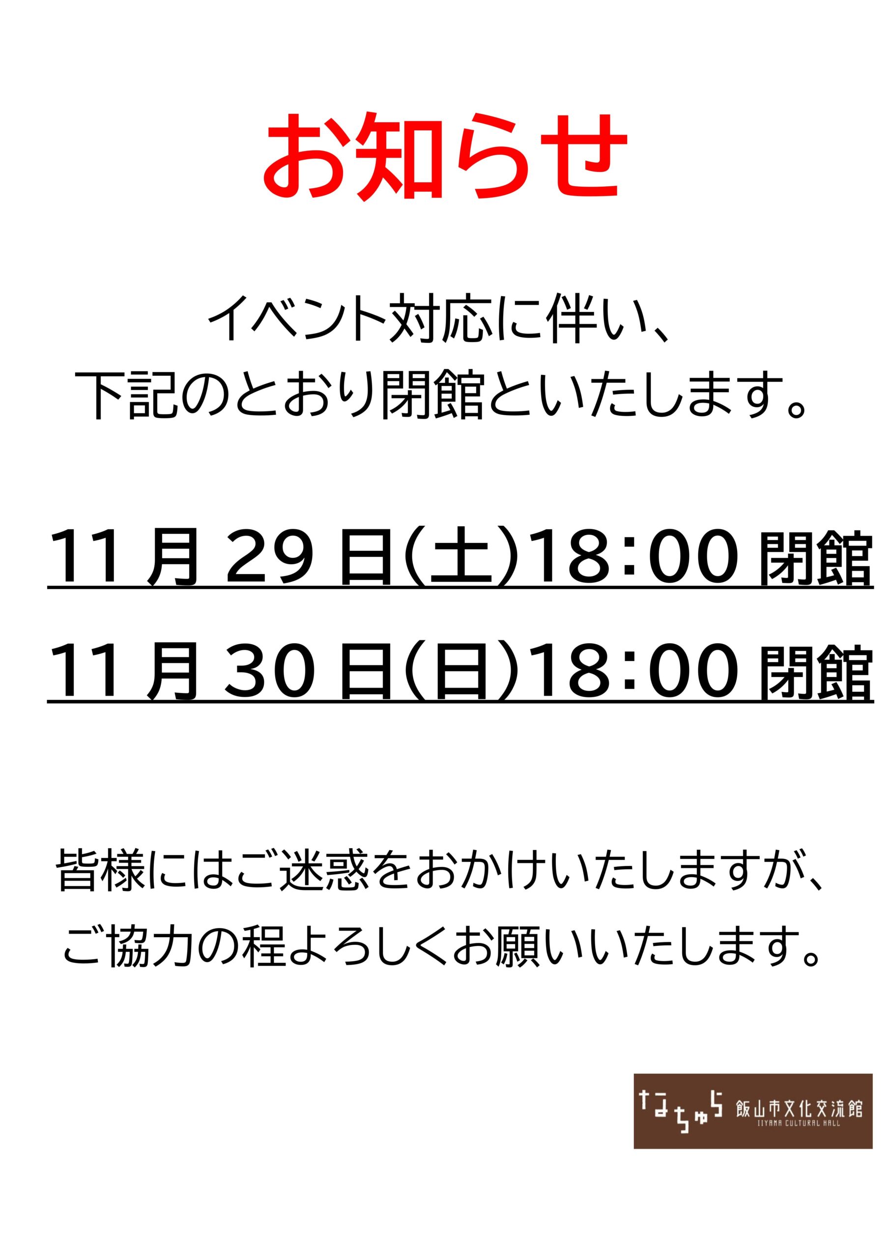 【お知らせ】11月29日(土)、30日(日)の閉館時間について